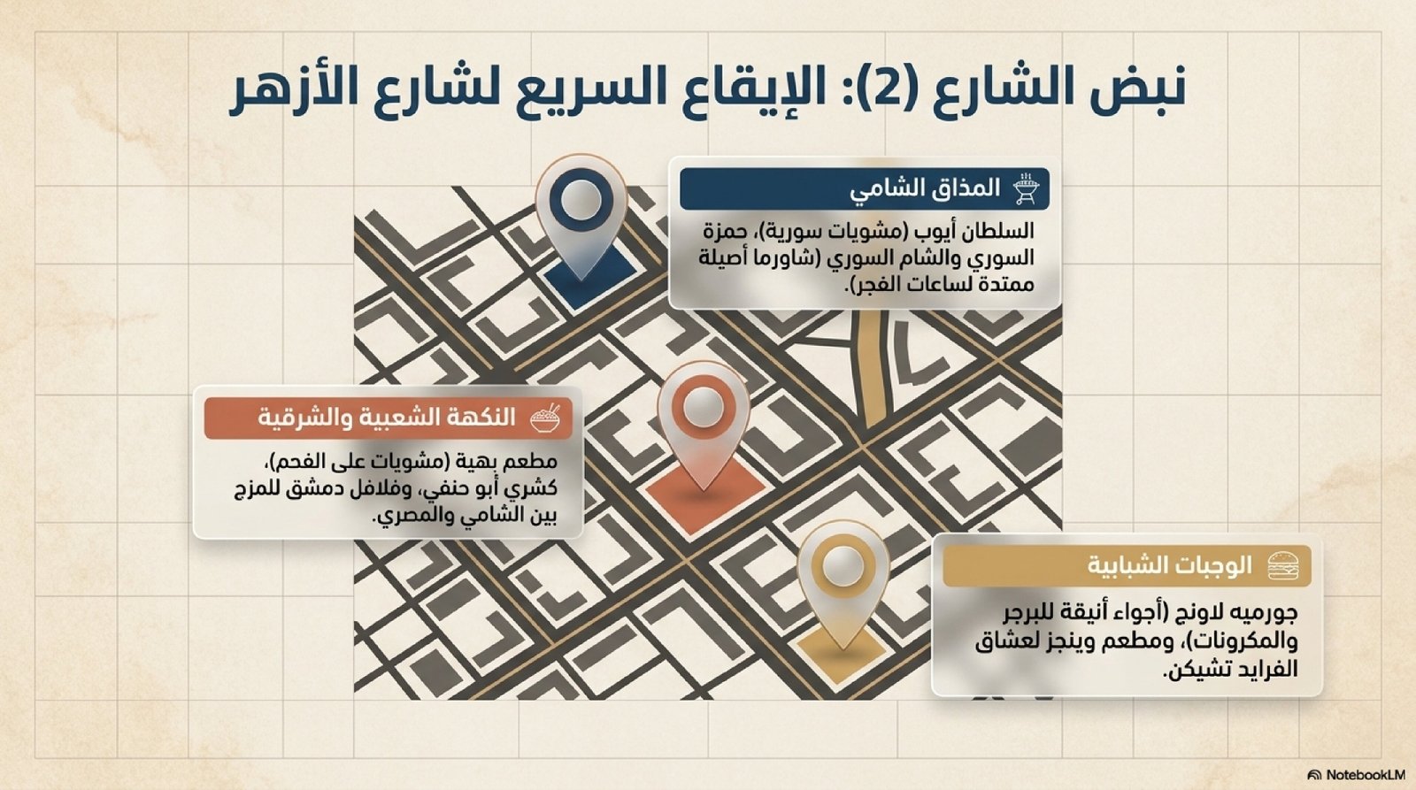 حي الأزهر: نموذج للحيوية التجارية، يبرز فيه مطعم (بهية) للمشويات والطواجن، (السلطان أيوب) و(حمزة السوري) للشاورما، ومطعم (كمونة) للمأكولات السورية، بجانب (كشري أبو حنفي).